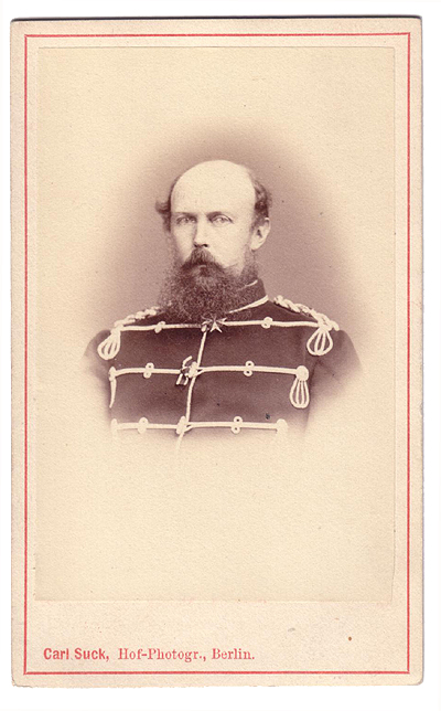 Nommé Lieutenant-Général en 1856 puis General der Kavallerie, il commande les troupes Prussiennes au Schelswig-Holstein en 1864 lors de la Guerre contre le Danemark. Il commande la 1ère Armée en 1866 lors de la Guerre contre l'Autriche. Il commande en 1870 la 2ème Armée qui remporte la capitulation de Bazaines à Metz - il sera fait Generalfeldmarschall au lendemain de cette victoire. On peut le voir ici dans la tenu du 1. Leib-Husaren Regiment dont il est muni de la Pelzmütze de l'ancien modèle, avant qu'elle ne soit raccoucie. Il est le 2ème Chef de ce Régiment. |